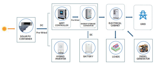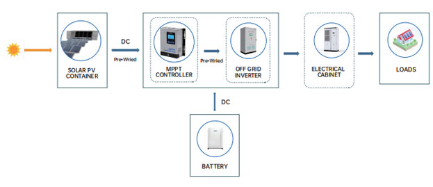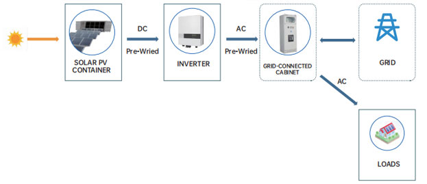 Déanann an t-inverter an sruth díreach a ghineann an modúl gréine a thiontú ina sruth ailtéarnach, a sholáthraítear ansin don ualach agus a nasctar leis an eangach. Ar an mbealach seo, agus an t-ualach tí á chomhlíonadh, is féidir an iomarca leictreachais a dhíol isteach san eangach freisin.
